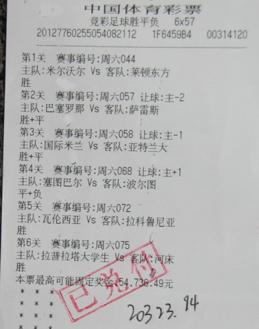 湖滨街02394网点连续10天中出大奖,在竞彩网点中名声响当当。4月26日,徐先生又带来两张竞彩中奖彩票,从这两张彩票可以看出投注人在做投注单时是很大胆的,两张彩票都选择了6场比赛,采用了竞彩游戏最新推出的M串N的投注方式,一张是4月23日周五的竞彩足球总进球数的玩法,投注人不仅选择了6×57的投注而且对每场比赛还进行了复式投注;另一张投注的是竞彩足球胜平负玩法,投注方式与前一张相同。幸运的是在进行复式投注的情况下,两张彩票6关全中,每张各中57注,奖金分别为66182.39元和20323.94元。