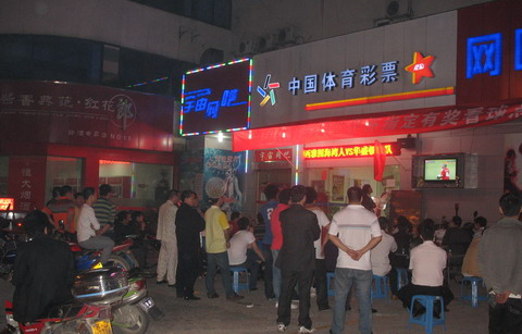 常州各大竞彩网点早在世界杯开赛前就已经行动起来,世界杯的元素占据了店堂的每个角落。市区荣亨逸都54030竞彩店、新北区旺角花园54005竞彩店,武进区湖塘人民东路54729竞彩店和鸣新东路54721竞彩店更是砸下重金,购置了大尺寸的液晶电视,直接搬到户外播放世界杯比赛,业主们纷纷表示,平常觉得自己的竞彩店挺宽敞的,可一到世界杯大家都来看球了,一下就挤得水泄不通,很多球迷来晚了一站就是好几个小时,干脆买个大电视放在店门口,再备置些桌椅,让大家看球也别累着自己!大液晶电视前每天都挤满了球迷,有些素不相识的球迷朋友看完一场球就变成一个阵营的支持者了,大家各自为喜爱的球队加油,那声势颇有些足球party的感觉。这其中做得最妙的要数武进湖塘新街的54716站点,直接用上高清投影仪配合幕布,用业主的话说就是,“我这装备,十里八乡都来看世界杯都没问题!”除了让球迷看得舒畅,各竞彩网点还为大家准备了啤酒和小食。