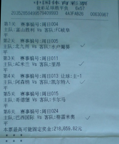 果不其然,李先生一改投注方式后效果就立竿见影。首次投注竞彩六串五十七并进行20倍倍投,虽然其中错了两场,但还是顺利斩获当期奖金12979.52元。