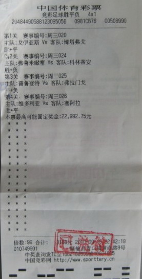 谈及这次中奖经过,王先生仍然很兴奋:“我买竞彩已经一年了,最喜欢玩竞彩的胜平负,这种玩法风险小,三分之一的中奖概率也蛮吸引人的,一年来在胜平负这个玩法上我已经中了几十次了,总奖金加起来也有七、八十万元了。我平时购彩一般都选两到三场比赛,这样组成的2串1,3串1的单子中奖率很高。昨天,我选了四场巴西联赛的比赛,因为把握比较大,便组合成4串1的复式票,倍投1980倍,就收获了31.9万元的大奖”。