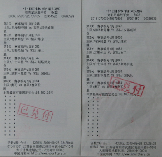 54715竞彩店位于常州市武进区常武中路7-10号,属于每日竞彩中奖名单上的常客,竞彩足球每每总能中出大奖。此次中奖的彩民在兑奖时并未现身,而是由店内的销售员代为领取。记者了解得知,这位中奖彩民是竞彩店内的常客,只要竞彩开卖足球比赛,那就肯定能在店内看到他的身影,投注比赛往往是自己研究结合店内的推荐,这次中奖的彩票也是如此。他采用的竞彩足球胜平负6×22玩法,选取的是周日的比赛赛事,4场挪威超级联赛、1场德国甲级联赛、1场葡萄牙超级联赛和1场巴西甲级联赛,所有比赛都单挑一个赛果,2张99倍的投注全中!