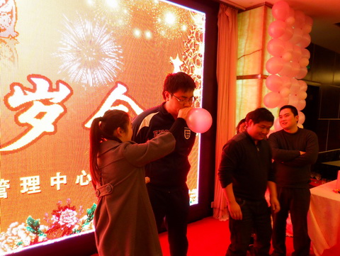 随后,广大竞彩业主、销售员一边品尝体彩中心精心准备的团年饭,一边参加精彩的抽奖活动和小游戏,现场气氛热烈。许多销售员主动上台表演节目,精彩的互动节目把贺岁会推向了一波又一波的高潮。体彩中心领导依次向在座的销售人员拜年,恭祝大家新年快乐,同时,向大家征求了对体彩工作的意见与建议。