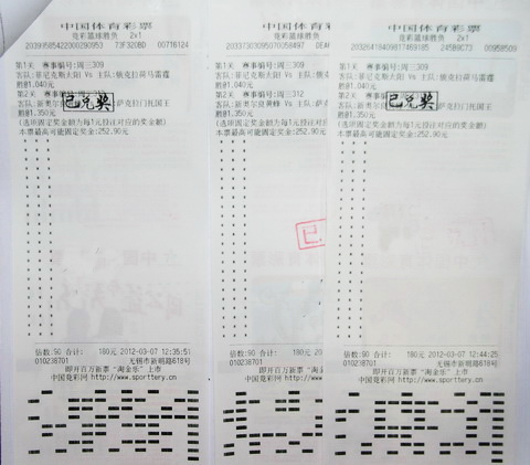 无锡彩民黄先生(化姓)因擅长竞彩篮球游戏、屡中2串1大奖,已经成了体彩中心兑奖的常客。3月9日下午,黄先生又带着厚厚一沓中奖彩票来到体彩中心,这次他投注的竞彩篮球胜负游戏为他赢得12万元奖金。