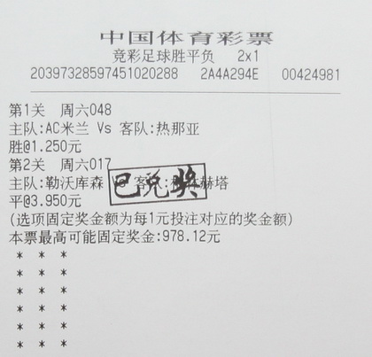 同样,周日的彩票“曼联VS阿斯顿维拉”和“马拉加 VS 皇家社会”两场比赛的情况与周六的两场比赛非常相似。钟先生凭借自己精准的判断,赢得了大奖。最后,经工作人员核对,钟先生两天的彩票共中得奖金19.3万元。