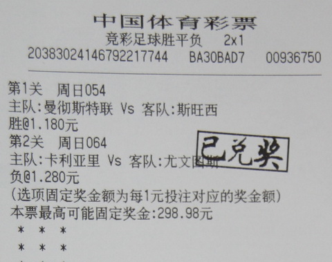 据了解,近期某先生连续中得几次十几二十万的大奖,让人佩服和羡慕不已,某先生本人自然也高兴,在谈到这几个大奖时,某先生说其实这并不希奇,“在选择比赛时,我都选了两场可做稳胆的比赛,再采用2串1的低关投注方式,这样中奖就容易多了。”就拿这次某先生投注的周日“曼联VS斯旺西”和“卡利亚里VS尤文图斯”两场比赛来看,双方实力差距明显,竞猜难度低,两场比赛串关投注再加以倍投,中得大奖不是难事。