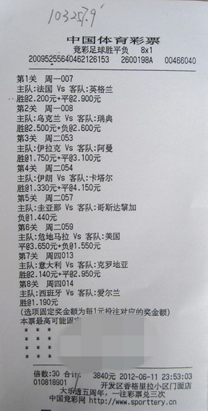 2012年6月,注定是让人激动的六月,精彩的欧洲杯还在继续,喜爱足球的朋友们可以走上街头,来到竞彩店,在享受足球带来欢乐的同时,说不定也能收获丰厚的奖金。(陈啸)
