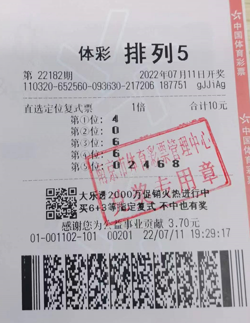 据了解,王先生带来的中奖票购买于玄武区成贤街3201001102体彩网点,作为一位资深彩友,王先生经常在店内研究走势图。在众多游戏中,王先生偏爱排列5,玩法简单且易于分析。在22182期中,王先生选购了一张直选定位复式票,由于前四位比较有把握,各选了一位数字。第五位觉得几个数字都不错,便都选上了。仅花费10元便轻松揽获排列5大奖10万元。