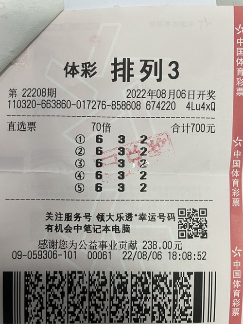 8月8日一大早,这位幸运的大奖获得者就来到市体彩中心领取奖金。据了解,大奖得主陈先生今年四十多岁,领奖时向工作人员出示了两张中奖彩票,从8月6日18时08分起先后出票,所选择的号码为“06、03、02”。其中一张彩票为700元的350倍直选投注,另一张为990元的495倍直选投注,两张彩票总计进行845倍直选投注。当晚开奖后,陈先生便通过手机查询到开奖号码正是“06、03、02”。第二天他便来到购买彩票的网点咨询了兑奖相关事宜,销售人员介绍道,由于是周末,体彩中心兑不了奖,得等到周一才能去兑奖。于是陈先生请好了假,周一上午来到市体彩中心领奖。