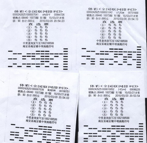 玩过体彩排列3的彩民可能深有体会,这个玩法其实就是一场狩猎游戏 。3月21日,该玩法10073期开奖,中奖号码为“555”,“豹子号”在间隔一年多后再度开出,当晚我省共中出5011注。而南通彩民赵先生“狩猎”最为成功,当期擒获1800注,总奖金达到180万。