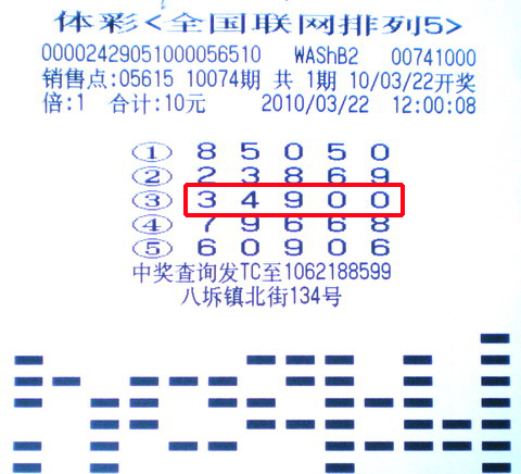 3月22日,“排列5”第10074期开奖,当晚吴江05615销售站点中的一注排列5,奖金10万元。