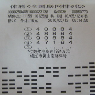 5月12日晚,体彩“排列5”第10125期开奖号码为“48884”,镇江11159号站点中出两注一等奖。