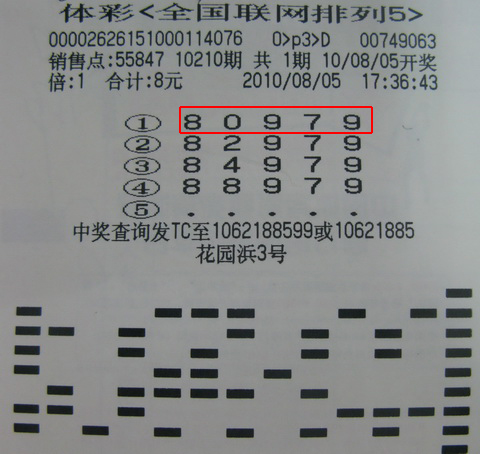 8月5日下午五点,王先生来到55847站点,根据他的经验,吃准了10210期“排列3”首位和末位必出大号,而以“8”和“9”的概率更高,中间应以小号为首选,因此花4元同时打下了“809”和“829”两注直选,而后又根据多期走势来分析当期“排列5”的号码,感觉后两位仍以大号为主,于是干脆直接打下了“80979”这注号码,但因为对第二位上的号码还有些疑惑,于是第二位上补投了“2” “4”、“8”,这样他一共选择了四注号码。当晚,10210期“排列5”玩法开出的号码正是“80979”,王先生只用12元,不仅中得了当期“排列3”直选1000元,更以他的智慧同时擒获“排列5”一等奖10万元,可谓“一箭双雕”。(常熟:郑晏峰)