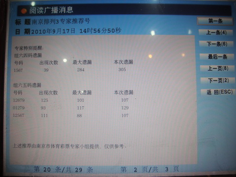 据了解,南京市体彩中心每天通过广播信息,将南京体育彩票专家小组的“排列3”推荐号发给每个体彩站点,这也成了不少彩民每天投注的重要参考资料之一。