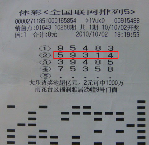 10月2日体彩第10268期“排列五”开奖结果为:“59314”,位于福润雅居25幢9号的01643站点中出一注10万元,而这个大奖就是这个体彩点的常客刘先生。