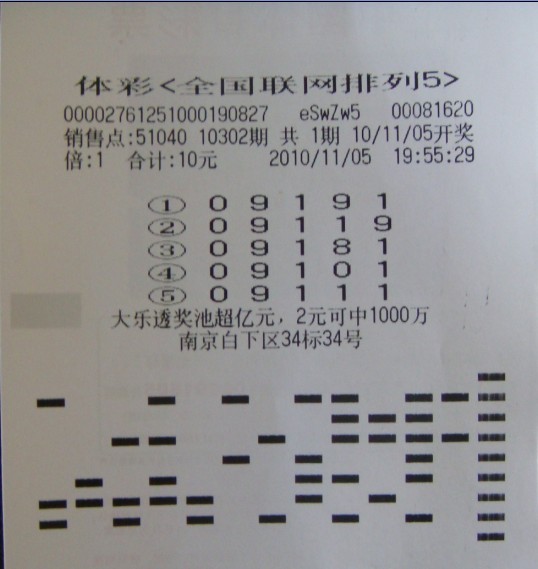 体彩“排列5”第10302期开奖结果为“09111”,位于南京市白下区34标34号的51040体彩站点中出1注10万元大奖,被一位老彩民张先生摘得。从他的中奖票上不难看出,张先生是认定了前三位“091”这个数字组合。