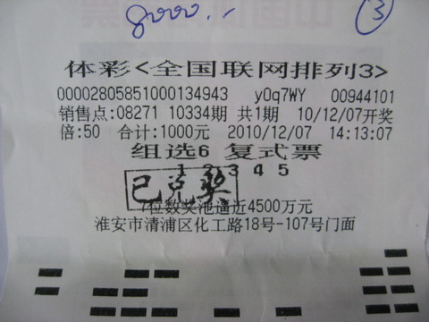 最近排列3对于淮安的彩民来说真是太“给力”了,接二连三的有人中奖,9日,洪泽小李刚领取排3六万元,10日,彩民陈先生(化名)又来到淮安市体彩中心领取中得的排三3万多元奖金。