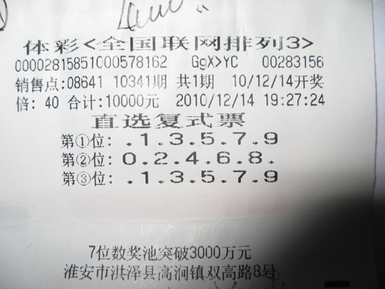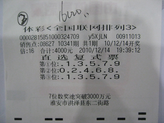 一见老熟人,淮安市体彩中心兑奖大厅的工作人员就热情地和小李打招呼,他也非常熟练的配合着工作人员进行着兑奖流程。 14 日当晚,小李到朋友家吃饭,路过位于淮安市洪泽县高涧镇的 08641 站点,就顺便买了 40 倍的“奇偶奇”直选复式票,然后就离开了,走到半路小李觉得买的不过瘾,想再买一些,于是就来到了洪泽县东二街路 08627 站点打了 176 倍直选复式票,看着彩票,小李心满意足的去往朋友家。当晚开出的号码为“ 9 4 3 ”,小李又擒获了 21 万多元。