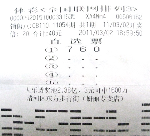 第二天,张小姐通过江苏体彩网得知开奖号码为:“7 6 0”,看着自己的票中了2万元,张小姐是激动的又蹦又跳。(虎 啸)
