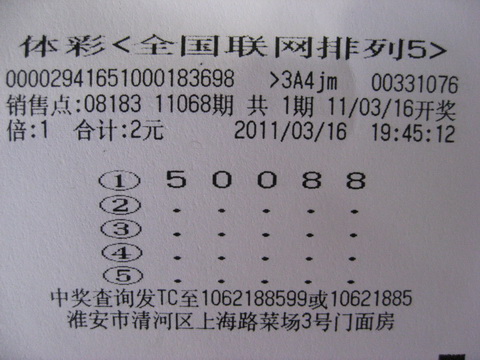 说来也巧,徐先生说16日晚,家里来了几位朋友,他就来到位于淮安市清河区上海路菜场买菜,买完菜之后剩下2元零钱,徐先生心想这2元零钱放着也有点“碍事”,不如干脆花了。这边想着,那边徐先生就看到了上海路菜场3号门面房那的08183体彩站点,于是他就走了进去。徐先生表示购买彩票就是他最大的爱好,因为排列3和排列5天天开奖,所以就逐渐成了徐先生每天晚饭后的“首要任务”。当看到有很多彩民围在那研究、讨论着,徐先生也想参与,但由于赶时间回家招呼朋友,他就让销售员随机打了一注排列5,然后就匆匆赶回家去了。