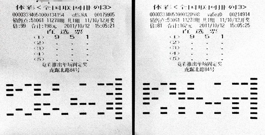 另外一位彩民中得当期排列3直选180注,奖金高达18万元,他也同样是坚持守号中得的大奖。“951这个号码我已经守了有些年头了,起初是翻着倍投注,后来变成每天加1倍,倍投到180倍的时候觉得这个数字很吉利,就没有再往下加了,只是有的时候突然来的兴致,会加到200倍。”这位彩民对倍投的坚持也最终有了回报。