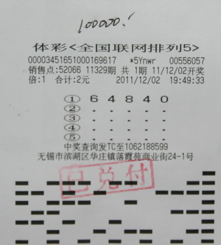 12月6日一大早,体彩中心就来了一位兑奖的彩民,他中得的是排列5第11329期10万元奖金。该期开奖号码为64840,江苏省仅中出1注,就是被这位幸运彩民收入囊中。