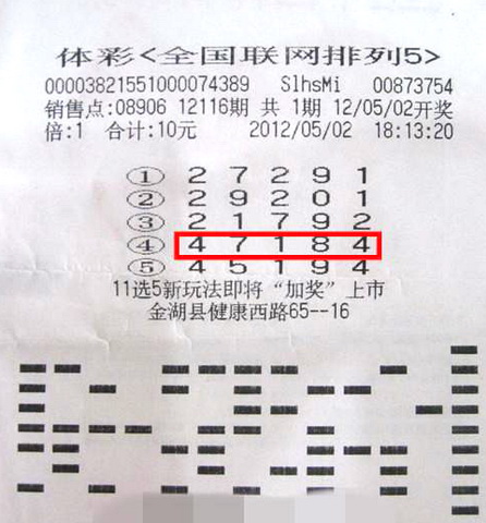 体彩排列5第12116期开奖号码为“4 7 1 8 4”,全省共中得4注,其中一注被淮安市金湖县健康西路08906站点一彩民摘得,中得奖金10万元。