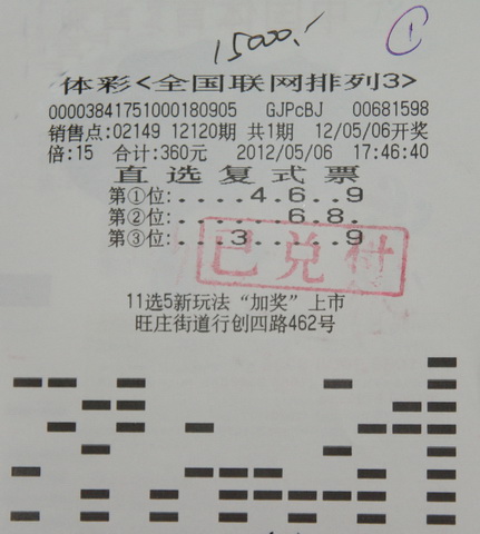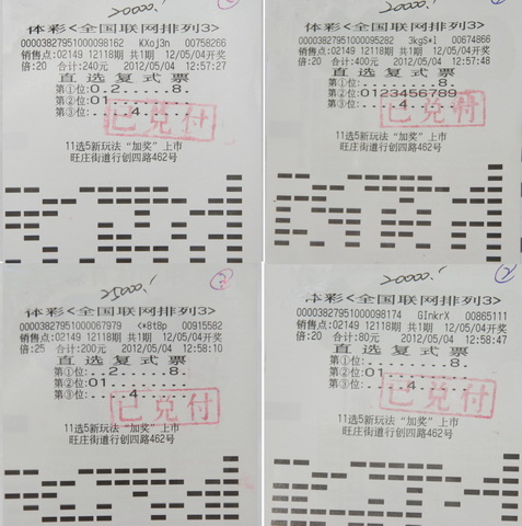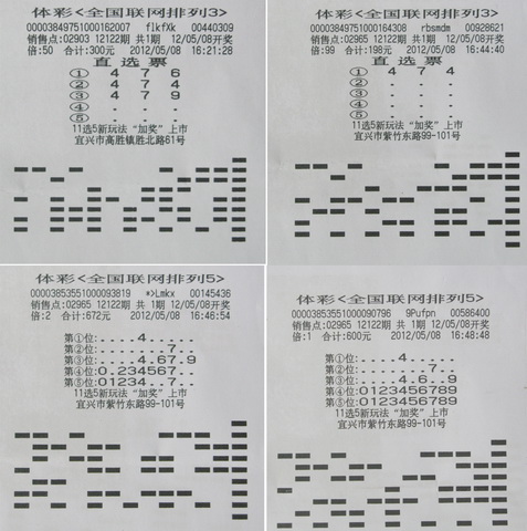 5月8日晚,排列3、排列5开奖后,宜兴的彩民老李(化名)心情既兴奋又激动,因为他投注的排列3、排列5都中奖了,奖金近55万元。他介绍说,买体彩排列3、排列5已经几年了,对这两个玩法是情有独钟。老李还有一个习惯,就是经常换站点买彩票,他说这样是为了结识更多的彩民,换换选号的思路。8日下午,他先在02903站点选择了三注排列3号码进行了50倍投注,然后又来到了附近的02965站点,又经过一悉细致的分析,选择了“474”,打了两张各99倍的直选彩票,又采用定位复式的方式投注了三注排列5,结果当晚开奖,老李一举中得排列5奖金30万、排列3奖金24.8万。