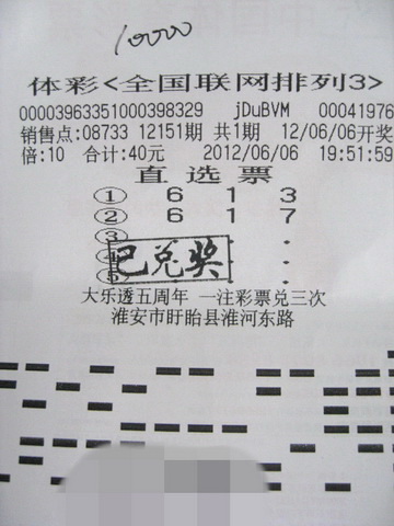 刘先生表示,自己坚持购彩已有好几年的时间了,现在有了回报,他非常的高兴。刘先生能中奖,肯定有自己的购彩秘诀,笔者请他分享下经验。他笑着表示,和大部分彩民一样,他也喜欢看走势图,观察大小、奇偶等组合,而且喜欢在位于盱眙县淮河东路的08733站点购买。6日晚上,刘先生照例来到站点,他先是和几位彩民聊了会天,然后就坐在一旁研究走势图。看了一会,他先买了一张5倍的直选票,然后又坐下来和周围的彩民聊天。将近八点时,刘先生又买了一张5倍的直选票。看着两张彩票,刘先生又研究起来,临近结束,刘先生果断“杀掉”几注号码,只留下“6 1 3”和“6 1 7”两注号码,然后倍投了10倍。最后的4分钟里,刘先生倍投了一张60倍的“6 1 3”直选票。