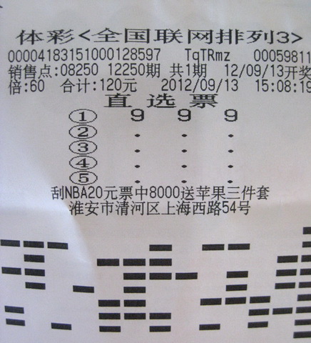 9月13日晚开奖的体彩排列3第12250期开奖号码为“9 9 9”,淮安小伙小金中得奖金90000元。