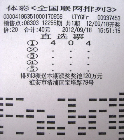 9月18日开奖的体彩排列3第12255期开奖号码为“4 0 4”,淮安彩民老李倍投20倍,一举中得奖金2万元。