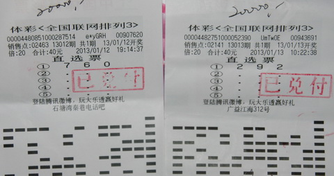 两位彩民不仅中奖玩法、奖金相同,连投注方式都是一样的,即单式直选20倍,而且都是仅投注了一注号码,就喜获奖金。不同的是投注时间和投注地点。经了解,其中一位彩民吴先生,他投注的是1月12日的排列3玩法。吴先生是在石塘湾秦巷的02463站点购买的彩票,他不仅是位体彩的老彩民,而且还曾多次中得排列3大奖。他每次投注都是自己研究选号,并且喜欢倍投。吴先生说,这是他进入2013年中得的第一个大奖,又因为要过年了,所以格外开心,希望这样的好运继续伴随他。