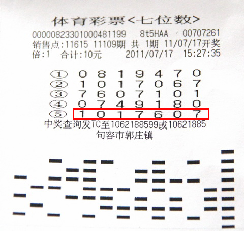 再看赵小姐的这张中奖彩票,是一张10元5注的7位数彩票,期号为11109期,中奖地点位于镇江市句容郭庄镇11615体彩站点。有趣的是这5注号码每注都挺有意思:第5注号码“1017607”正是当期的中奖号码;第2注号码“1017067”因前四位和中奖号码相同,结果还中了300块;第3注号码“7607101”是将中奖号码前三位移到了末尾;而第4注号码则是第1注号码的倒排位。据了解,原来这几注号码是由赵小姐一家人精心编制而成的,早在一年前就开始投注,赵小姐负责跑腿,非常幸运的是仅投注一年就斩获了500万大奖。