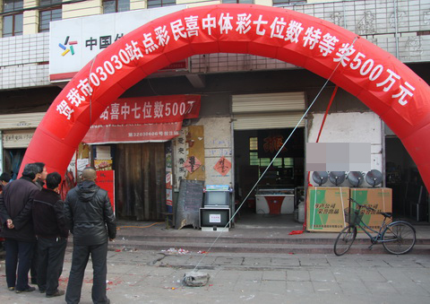 据悉, 03030站点位于贾汪区旗山矿工人村,地理位置优越,销售良好,站点中奖率较高,但中出特等奖500万还是第一次。一早,站点便竖起了拱门,张贴了横幅,响亮的鞭炮声吸引了周围许多人前来驻足观看。据销售员小陈(化姓)称,当天来站点购彩的人比较多,具体谁是大奖得主还不能确定,但估计是位老彩民采用随机投注的方式中得大奖。在大奖的带动下,站点销售比以往更好了,只见大家纷纷进行投注,有的要打7数,有的要打大乐透。“现在快到年底了,而且7数和大乐透的奖池都比较高,我要多打几注,一能增加中奖率,二也能沾沾站点的喜气,争取拿个大奖迎接新年!”彩民老张笑着说。