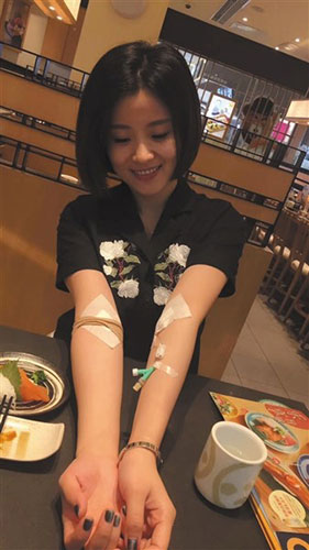 微博作者是一名来自杭州的28岁女生叫许艾菲,她所分享的是自己捐献造血干细胞的经历:“四天八针,两个手臂感觉要成马蜂窝……”