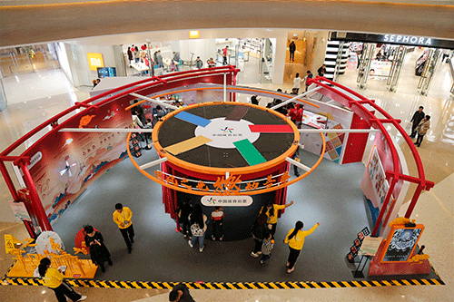 其他区域的精彩互动更是让人目不暇接,LED旋转光影圆盘前,屏幕上的“体彩公益金”展示效果让不少年轻人感叹神奇,一位参与互动的小朋友,随着显示屏的变换不自觉地跟着旋转跳跃;“国风”拼拼看区则是把线上的拼图搬到线下,并增加了难度,拼图由四块碎片变为八片,观众们直呼一边拼图一边感受“国风”文化,简直太好玩了;而在抽奖区,观众通过领取“国风之光、燃动善举”卡片,完成现场3个互动或在现场拍摄3张纪念照发布朋友圈,即可集齐三枚印章,赢取抽奖硬币,并亲自将硬币放进摇奖机,旋转后待粉色奖球掉出,赢取鼠标垫、水杯、魔方、背包、丝巾等敦煌文化纪念礼物。
