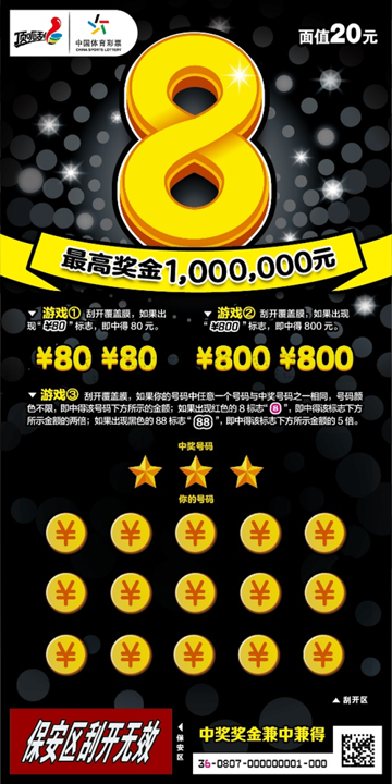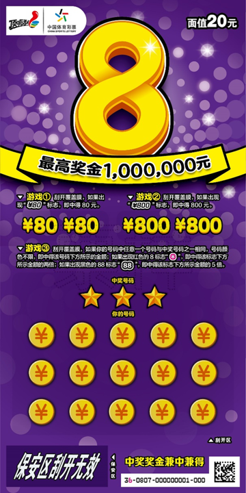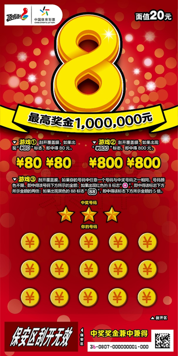 面值20元的即开票“8”,是一款经典顶呱刮游戏,早在去年登陆江苏彩市后就备受关注。在玩法设计上,该票采用找奖金符号+数字匹配的方式,票面共分为三个游戏区;单票中奖机会多达19次,最高奖金100万元。