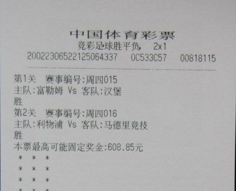 该竞彩投注店店长介绍说,中得百万大奖的这位彩民投注的是较为简单、容易中奖的足球胜负平2串1玩法。该彩民选择了富勒姆VS汉堡和利物浦VS马德里竞技两场欧联杯半决赛次回合的生死战。这两场比赛的竞猜难度并不是太大,因为首回合富勒姆与马竞都在比赛中表现不俗,前者在客场逼平了德甲劲旅汉堡,而后者则在主场1:0小胜近期状态不佳的红军利物浦,因此富勒姆与马竞的晋级前景一片大好。最后的结果也在预料中,富勒姆在主场先失一球的情况下连扳两球,最终2:1淘汰汉堡;马竞虽然在客场1:2负于主队利物浦,但凭借头号前锋弗兰在加时赛的进球,凭借客场进球多的优势淘汰利物浦,与富勒姆会师最后的欧联杯决赛。彩民正是通过精准的研究与分析,看准主队获胜果断倍投,将124万元奖金收入囊中。