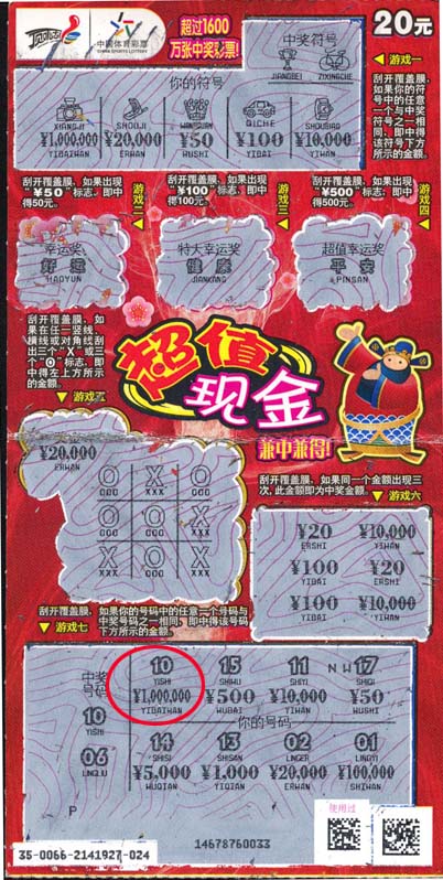 喜获100万元大奖的小王是一位90年出生的小伙,今年刚满20岁,说起这次中奖经历连他自己都有点不可思议。7月4日,小王和几个好朋友来到苏州常熟旅游,下午5:00多,一场突如其来的大雨把小王和几个同学淋了个正着,他们顺势跑进了附近的一家体育彩票销售站点。正当感觉无聊时,小王和朋友看到几个人正在刮着什么东西,经打听得知,他们刮的是顶呱刮彩票。小王和朋友也分别买了几张刮了起来,小王选择了一张5元彩票,刮开一看中得了50,而后,他又买了一张“超值现金”,在游戏七中,号码“10”给他带来了惊喜,100万的奖金就这样飞进了小王口袋。