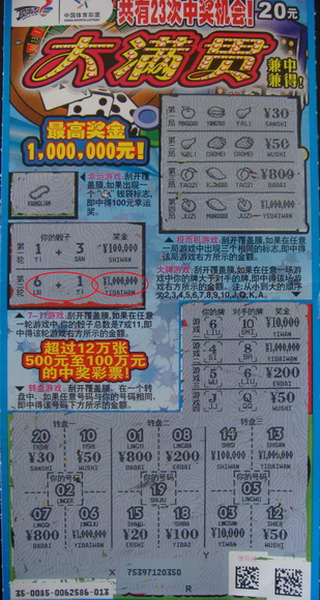 即开体彩顶呱刮20元新票“大满贯”在我省上市不久,就为我省彩民送出了巨大惊喜。在该票种上市的第二天,南京彩民一举刮出了100万大奖,这也是“大满贯”的全国首个百万大奖。