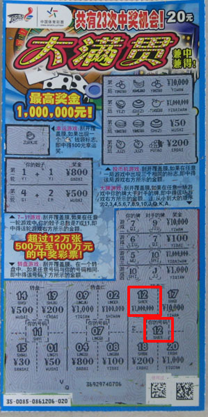 为迎接第十七届省运会在常召开,10月1日至31日凡购买“顶呱刮”即开型体育彩票,且单张中5000元(含)以上的彩民还可额外获得天翼3G手机一部。另外从10月11日起,至11月14日止,凡购买20元面值票且单张中奖200元(含)以上,再奖励任意品种的100元“顶呱刮”彩票。很幸运的是,小金两项活动均符合条件,因此除了收获百万大奖,他还赢得手机一部,100元即开票,在选择什么品种的即开票时,他毫不犹豫的要了5张“大满贯”,“这是我的幸运票种,不选他选谁呢!”
