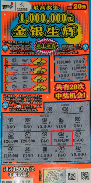 作为顶呱刮百万家族的新成员,“金银生辉”票面时尚亮丽、游戏经典好玩。其最大特点是在印制工艺中加入了荧光技术,这在全国彩市尚属首创。“金银生辉”每张面值为20元,拥有3个游戏区,最高大奖100万元,是继“点石成金”、“冲向顶峰”、“财神到”、“超值现金”、“前进·钱进”和“大满贯”之后,顶呱刮推出的第七款百万票种。相信随着首个百万大奖的到来,“金银生辉”还将带来更多时尚、幸运的感觉。(黄珊)