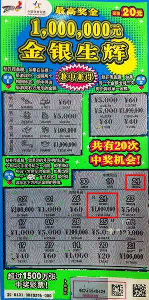 张先生的中奖票是一张荧光绿色的“金银生辉”,在经典的数字匹配游戏中,他刮出了和中奖数字一样的“24”,在这个数字下面,奖金显示“1,000,000”。
