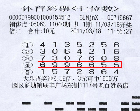 在本期的投注中,小李还是像往常一样选择了10元钱随机投注,第4注号码“6996655”正是7位数11040期的中奖号码,奖金为343万元。由于7位数一直频繁中奖,当期的奖池并不高,起初小李还不大乐意投注,不过凭着对体彩的喜爱还是让他走进了体彩站点打下了这张票。试想一下如果没有小李的这份坚持,或许这个大奖就不存在了。
