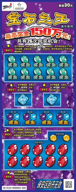 拥有即开之王头衔的“宝石之王”终于和我省广大彩友见面了,几乎网罗了所有稀世宝石的票面宛如一个寻宝迷宫,那么我们如何破解呢?轻启你的指尖,游走五个奖区,150万巨奖就在这宝石迷阵中。