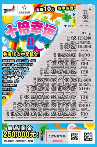 刮开覆盖膜,如果在任意一场游戏中的任意一个号码与中奖号码相同,即中得该游戏右方所示的金额;如果出现一个幸运草的标志,即中得该游戏右方所示金额的十倍。该票每张10元,有10次中奖机会,最高奖达到25万元,兼中兼得。(郑俊春)