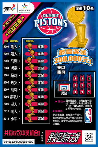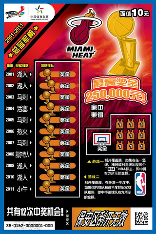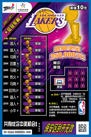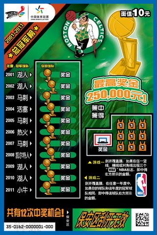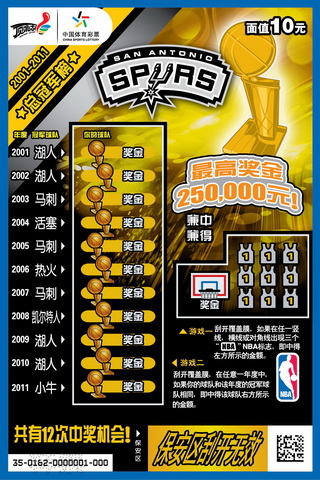 顶呱刮“NBA总冠军票”系列彩票为10元面值,最高奖金25万。该系列共有6张彩票,票面分别以2001-2011年登上NBA总冠军宝座的湖人、马刺、活塞、热火、凯尔特人和小牛队等6支最著名球队的队徽为主题,球队队徽与NBA总冠军奖杯在票面上交映生辉,这也是此款票的最大特色。