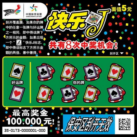 此款“快乐J”面值5元,共8次中奖机会,最高奖金10万元。只要刮开票面上的10张扑克牌覆膜,中奖结果立刻见分晓。如果“你的牌”中任意一张牌与“好运牌”之一相同,即中得该牌下方所示的金额;如果出现一个“快乐J”标志,即中得该标志下方所示金额的两倍,兼中兼得。