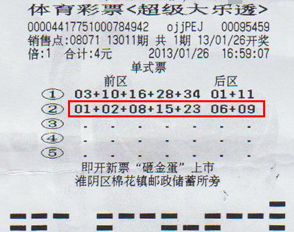 1月26日晚,“超级大乐透”第13011期开奖号码为“01 02 08 15 23+06 09”,我省中出1注一等奖,奖金825万元,被位于淮安市淮阴区棉花镇淮高路的 08071站点中得。当时销售员回忆,中奖者大概三十岁左右,喜欢大乐透和顶呱刮,每次购买彩票不超过10元。1月26日晚,他买了两注大乐透,1注追加,1注没追加,其中的一注中了大奖。而事实上上,中奖票显示的是4元两注大乐透的单式票,并没有采用追加,其中第2注为本期的中奖号码。