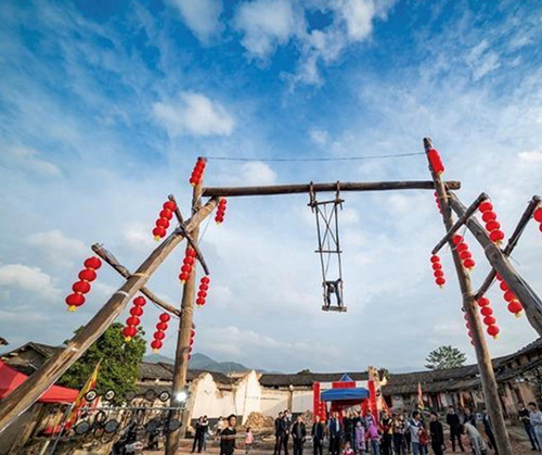 直到如今,秋千的搭建过程仍遵循着古老的人工搭建法——每年农历十二月初一,村民们会合力从池塘里将搭建秋千的木材打捞起,抬到村中浮山城的秋千坪上。经过一个月的晾晒,于正月初三开始正式搭建。“通过这个多人参与的集体项目,整个村子的民心和凝聚力自然就会融合起来。”杨凯说道。